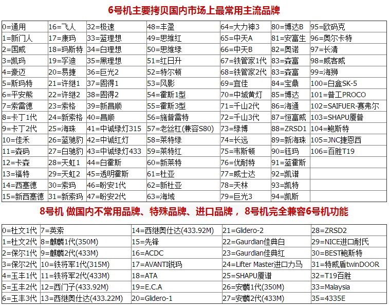 6號/8號子機(jī)遙控器可復(fù)制拷貝的品牌如下: